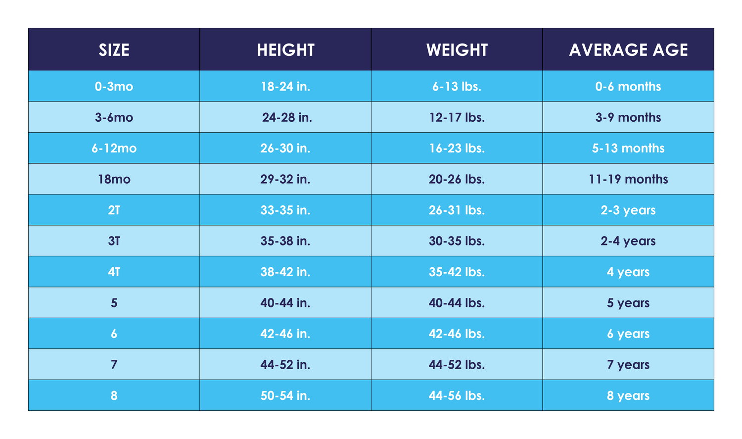 Industry standard for baby and toddler apparel is to use age as the size, however we do recommend measuring a child as it is possible to have an older child that needs a smaller size, or vice versa. For example, a baby that is 14 months may still be wearing a size 6-12 month given his or her other measurements. If your childs measurements fall between sizes, we recommend sizing up to ensure a better and longer lasting fit. Please refer to the chart below for measurements: