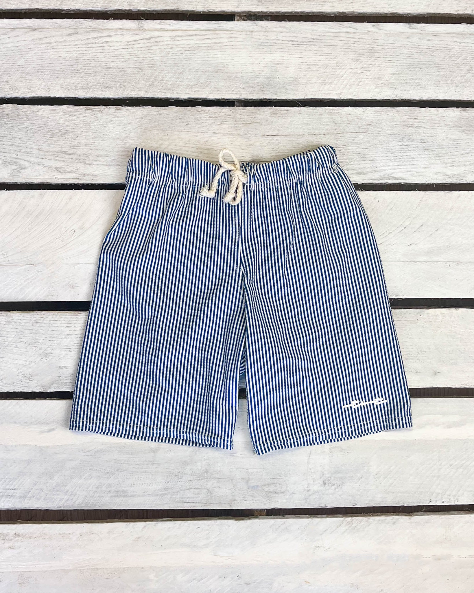 Your little one will be ready to get sandy in these navy seersucker board shorts. These classic and cute shorts are made with UPF 50+ four-way stretch seersucker with a comfortable elastic waistband and white drawstring tie. Inseam hits above the knee. White TT logo on left leg.