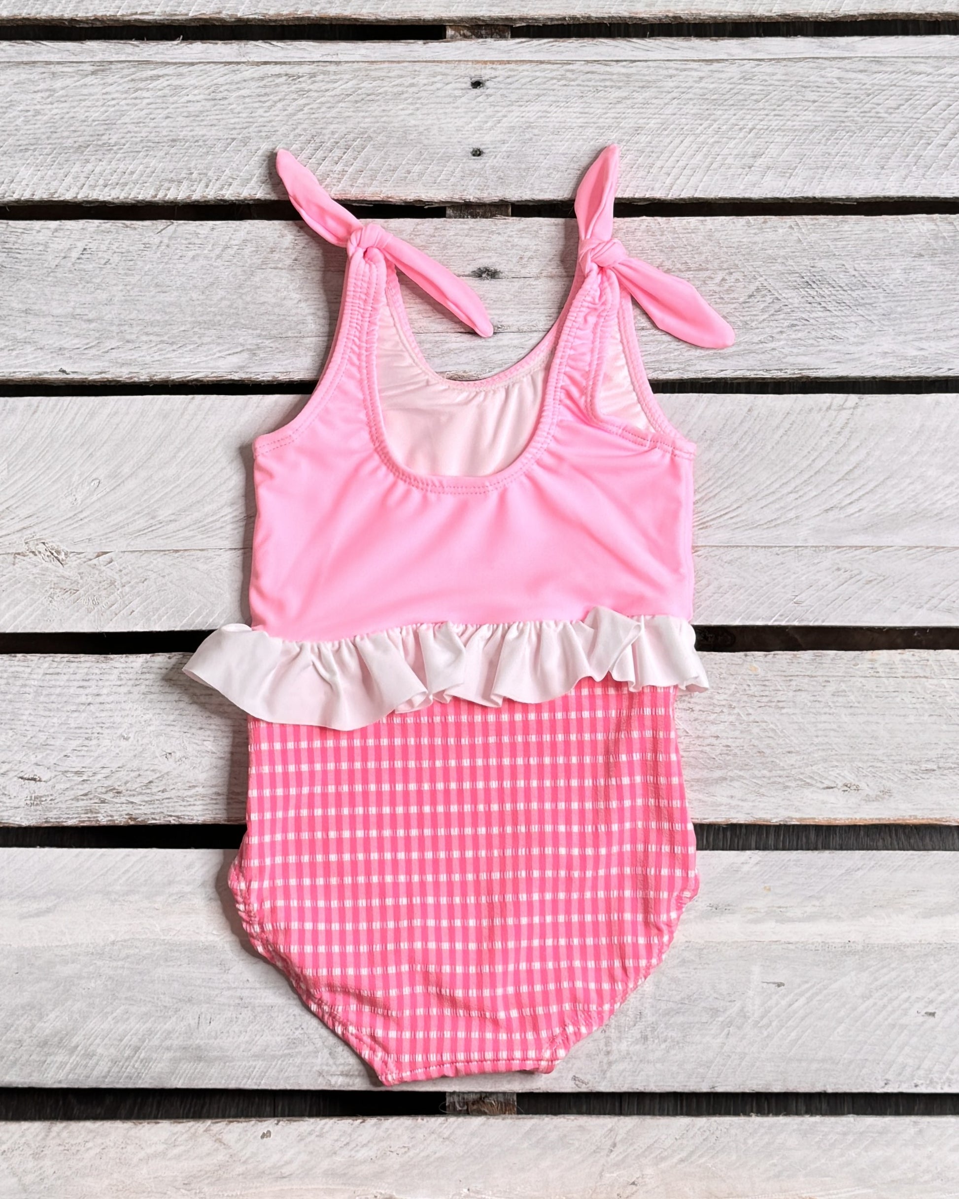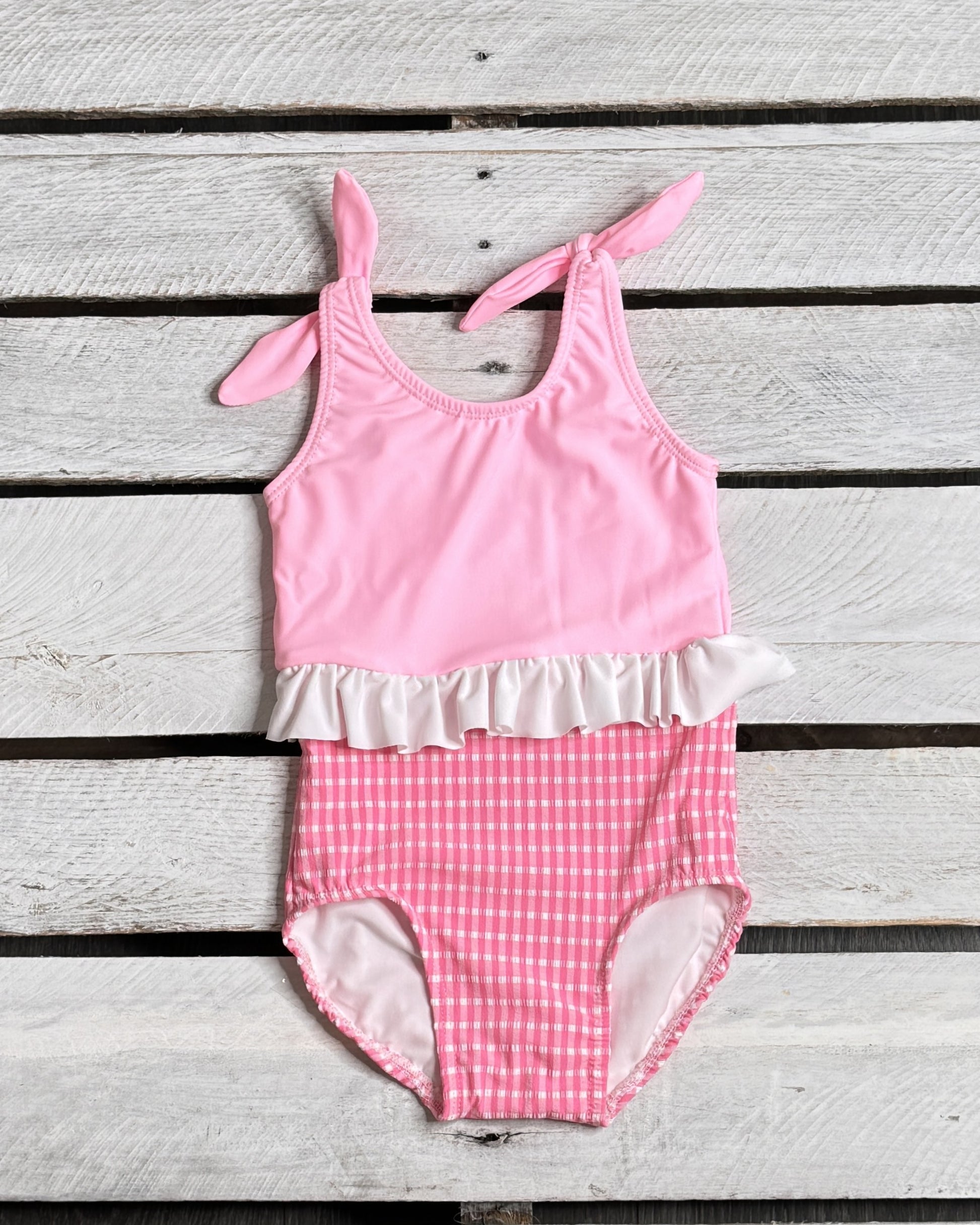 Bring timeless charm to beach days with our cute toddler and children's swimwear! This adorable Girl's One Piece Skirted Swimsuit features our Pink Textured Gingham Fabric paired with a pink spandex top and white skirt around the waist! All of our swimwear is made in the USA! Looking for matching sibling's swimsuits? Click HERE to shop the whole collection! Looking to match siblings? Click HERE to shop the whole collection.
