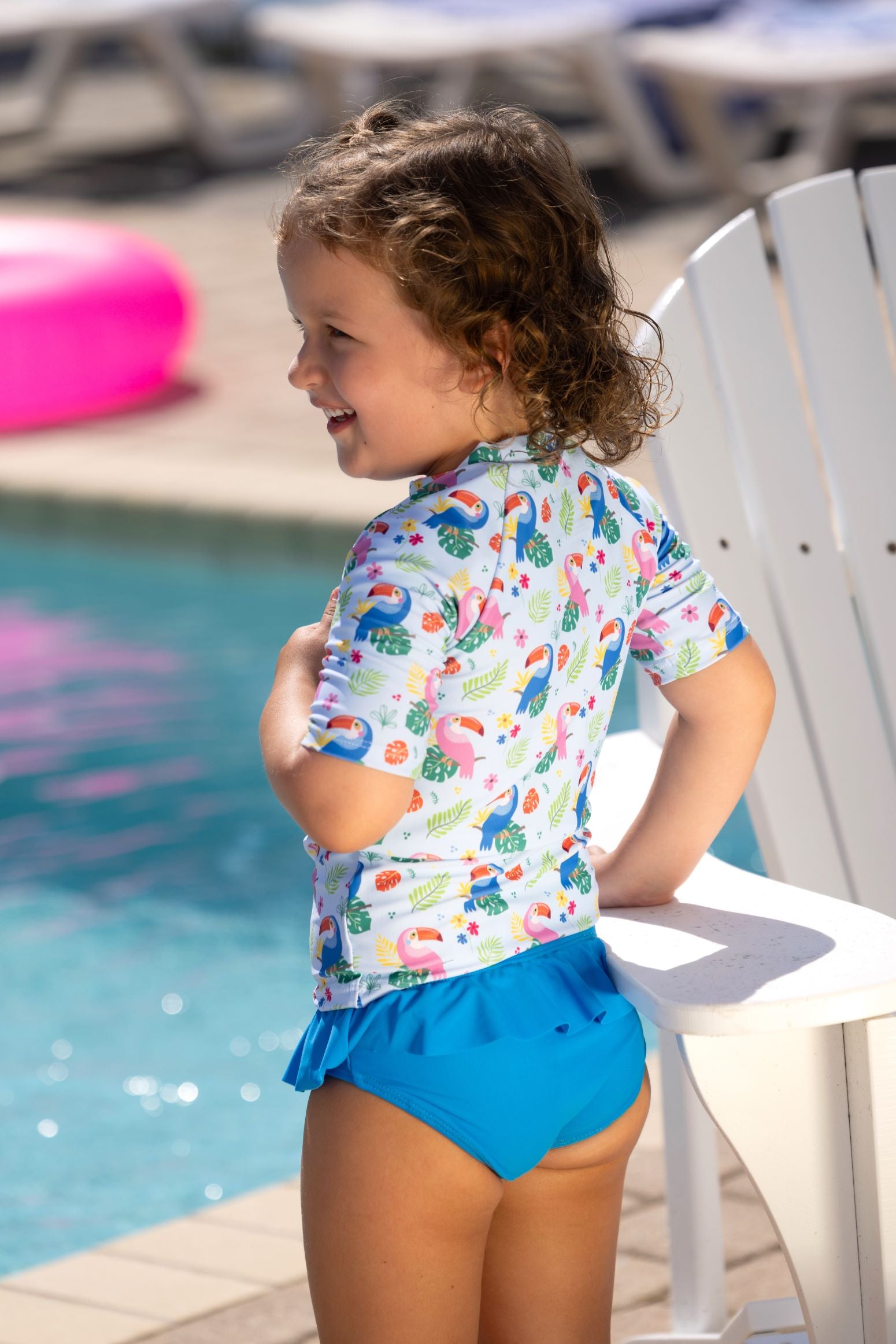 Tou-can see why we call this collection Too Cute Toucans! This two piece set includes our girls short sleeve shirt with skirted ruffle bottoms! As always our suits are made with UPF 50+ fabric and made in the USA!